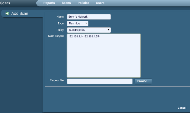 Now you are ready to Run a Scan against targets. Click Scans and Add.